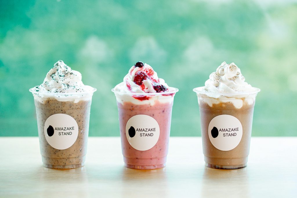 (画像) 甘酒ドリンクはイートインもOK。左から「黒ごまバナナ甘酒」(650円)、「ベリー甘酒」(620円)、「ほうじ茶甘酒」(650円)