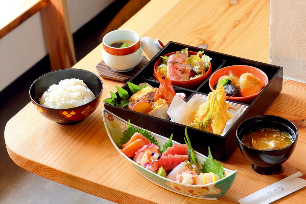 「お造り7点」か「日高見牛ステーキ」が選べる「松花堂弁当 特上」(1,750円)※店内利用限定