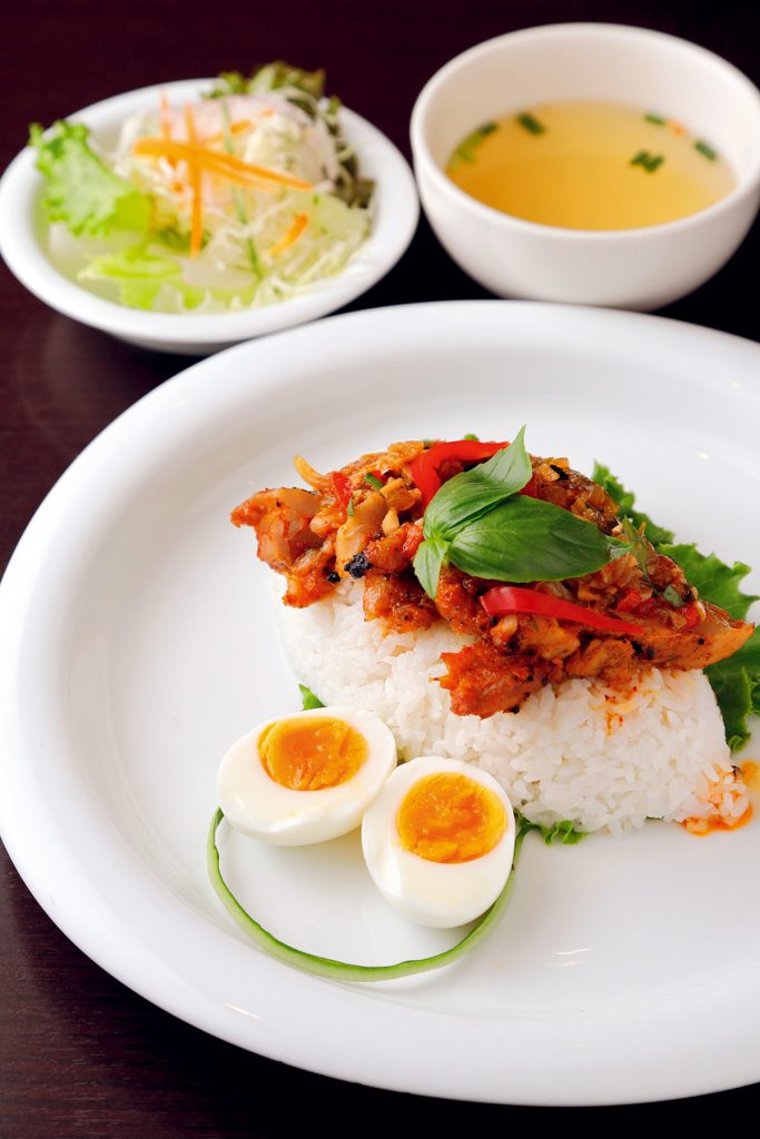 肉厚の鶏モモ肉で食べ応え抜群の「ガパオチェンマイライス」(1,100円)※サラダ、スープ付