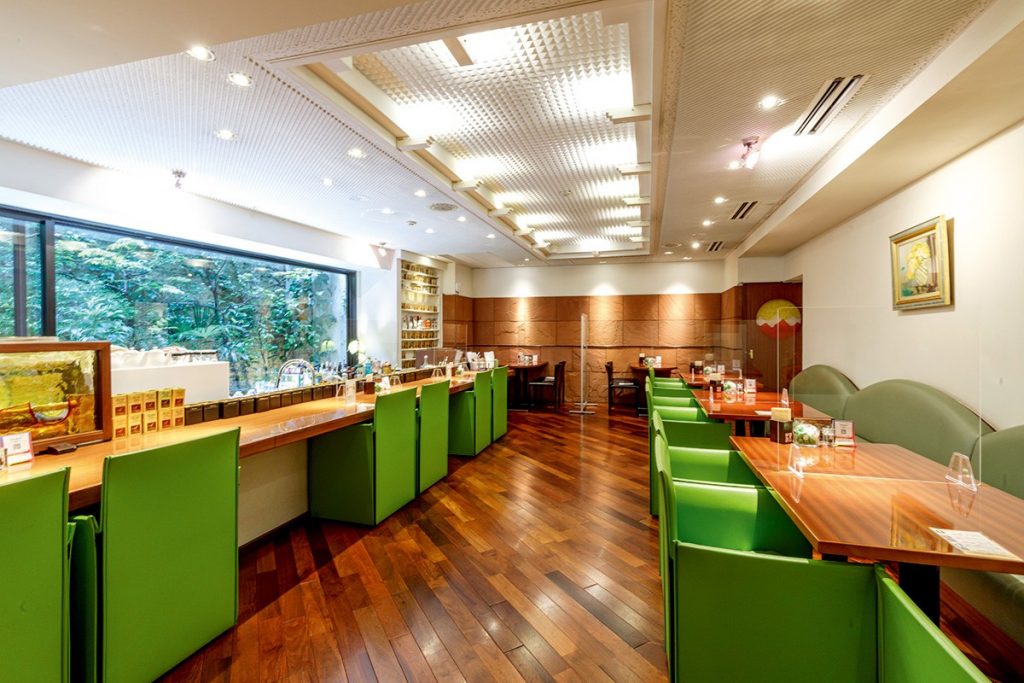 静かで居心地がよい店内。大きな窓からは木々の緑が見え開放感があります
