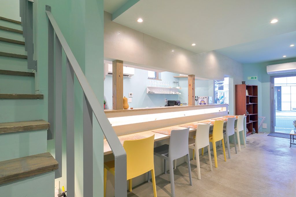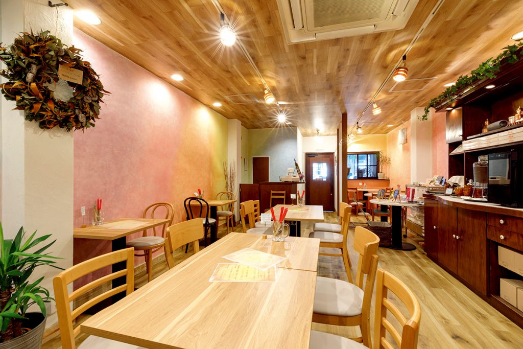 オーナー家族や仲間たちで塗ったという、パステル調の漆喰壁が温かみを醸し出す店内