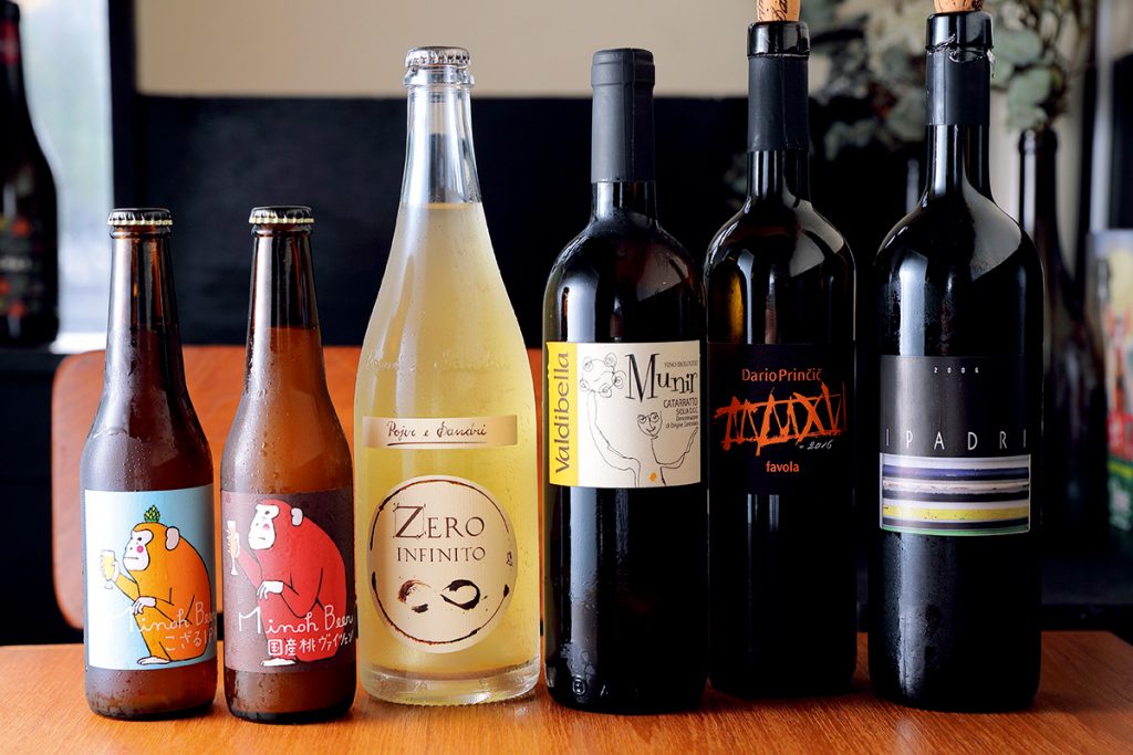 作り手の個性が光る自然派ワイン(グラス770円~)ほか、大阪のクラフトビール「箕面(みのお)ビール」もラインナップ
