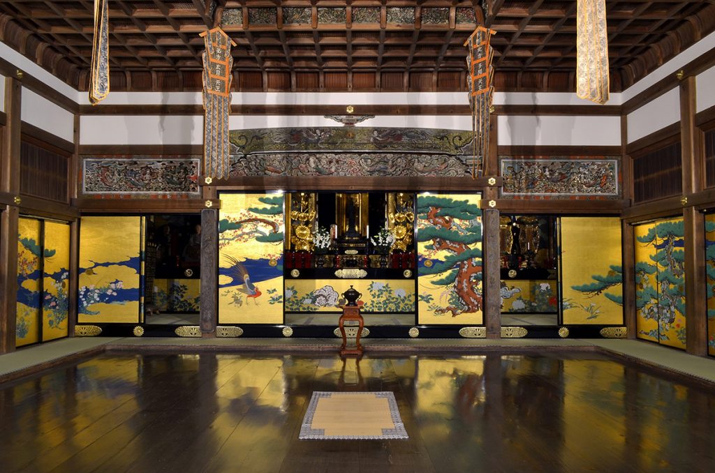 鮮やかな孔雀が描かれた襖絵は、冬、春、秋と景色が変化。歴代藩主の位牌が安置されています