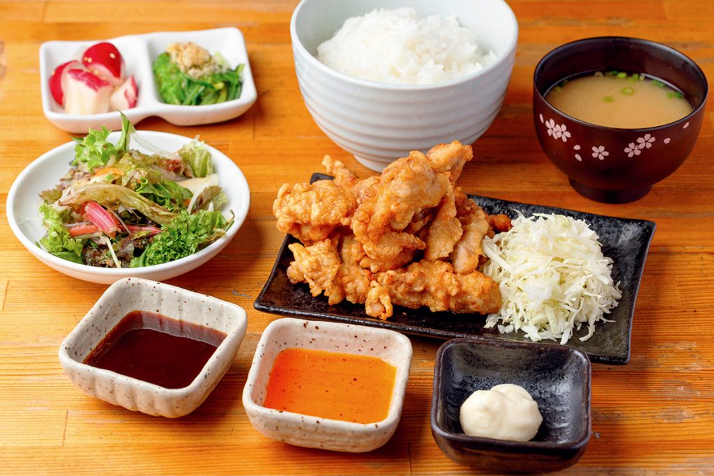 コロナ禍を経て昼営業を始めた『杜の味土心』。人気居酒屋のランチは、盛りの良さが魅力です。おすすめは「本気の鶏から定食」(700円)。つまみとして絶大な人気を誇る唐揚げを、夜のボリュームのまま提供しています。1枚分の鶏モモ肉を醤油、ショウガ、ニンニクなどでしっかりと下味付け。カラリと揚げて、たっぷりの野菜とご飯と一緒に盛れば、ボリューム満点のワンプレートの完成です。漬けダレは、マヨネーズ、ネギ塩、ユーリンダレから選べますよ。