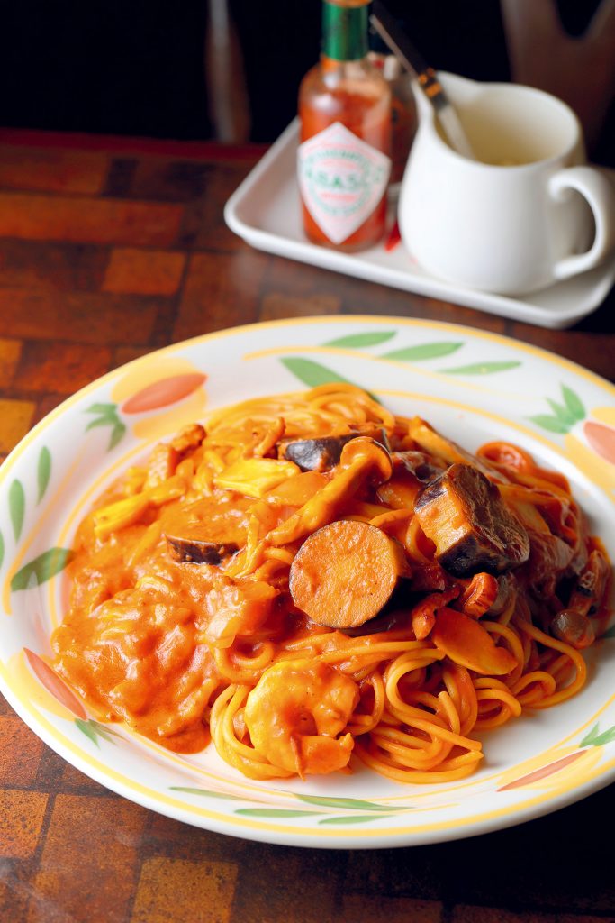 創業37年を超える老舗喫茶店『タピオラ』。2枚看板のスパゲッティとピラフは、「ナポリタン」「ミートソース」「カレー」「タピオラ風」の4つの味付けから選べます。なかでも、店名の由来である“森の神様”をイメージした「タピオラ風」は必食ですよ。マッシュルームやシメジなど、キノコたっぷりのホワイトソースは、やみつきになる味わいです。