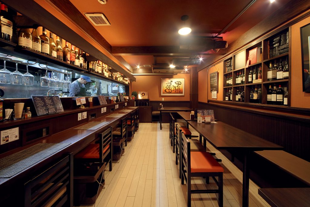 昼はイスが並ぶカウンター席。夜になると立ち飲みスタイルに変身します