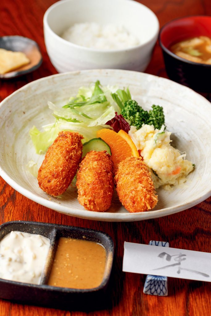 しっとりと隠れ家的な雰囲気が漂う『酒菜 雷蔵』。「鶏コロッケ定食」(850円)は、オープン当初から人気のランチです。ひと言で表現するならば“鶏肉メンチカツ”。サックリとした衣の中には、ふわっとジューシーな鶏肉が。ヘルシーな鶏肉をふわふわのミンチにして、ひとつずつ丁寧に作っています。自家製タルタルソースとゴマダレで味わいを変えながら楽しめますよ。