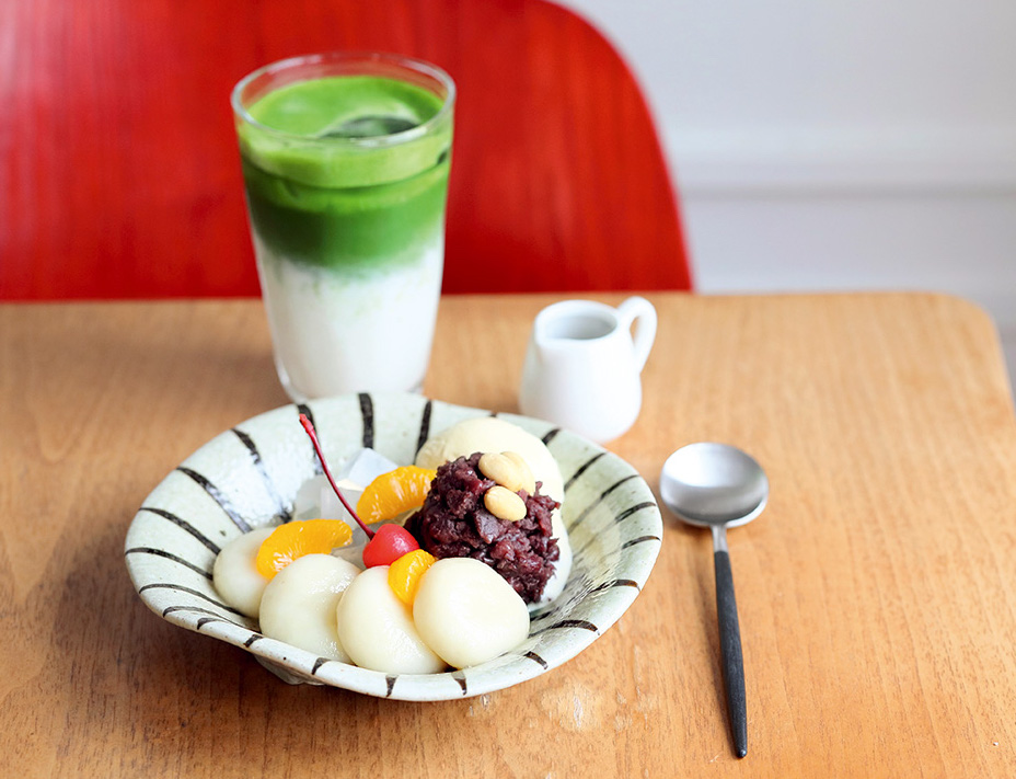 「白玉クリームあんみつ」(770円)と「アイス抹茶ラテ」(605円、テイクアウトの場合は594円)