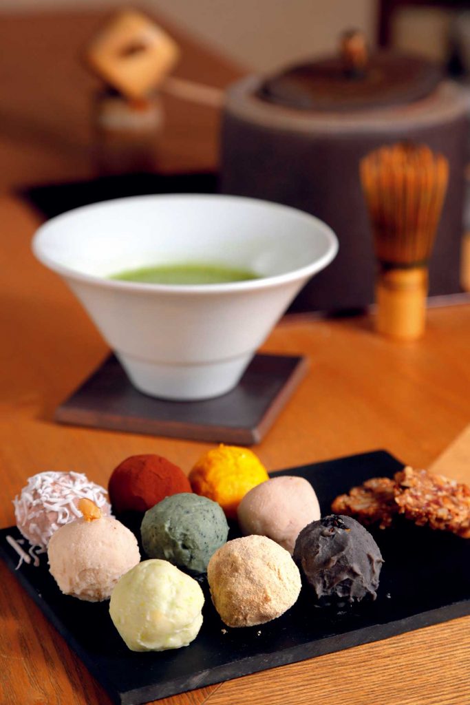 オリジナル抹茶菓子「そよ玉」(各250円)、「そよ板」(250円)と、「抹茶(薄茶)」(500円)