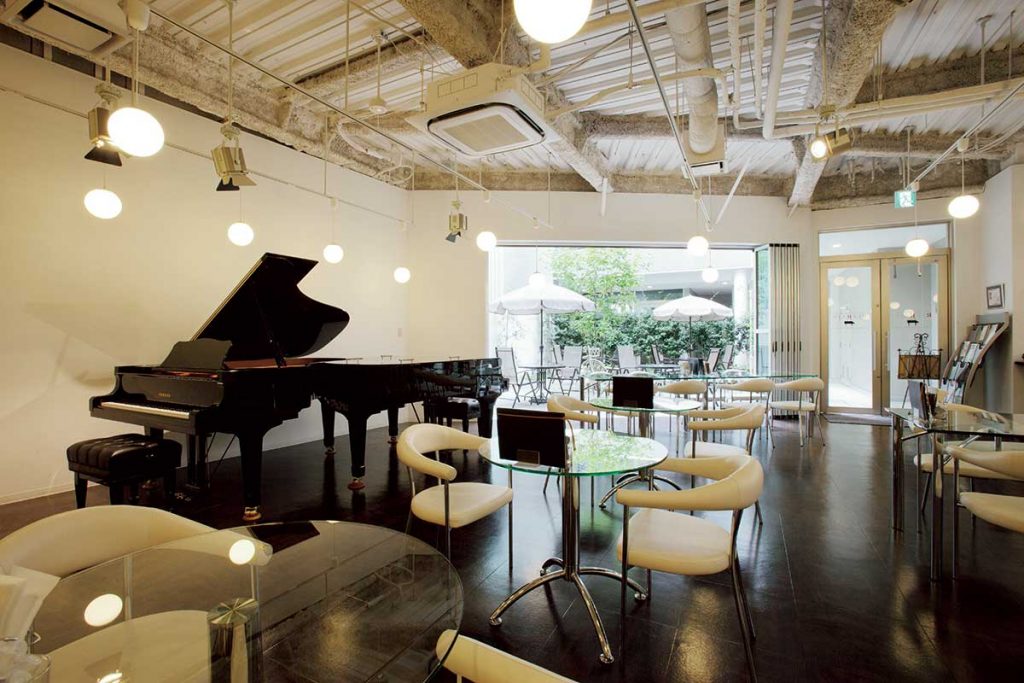 グランドピアノが目を引く店内。クラシックコンサートや発表会などのイベントにも利用できます