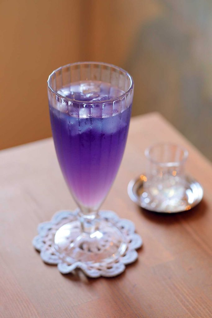 神秘的な青い色合いが特徴的な「アイスハーブティー」(550円)。レモンシロップを入れると、色の変化が楽しめます