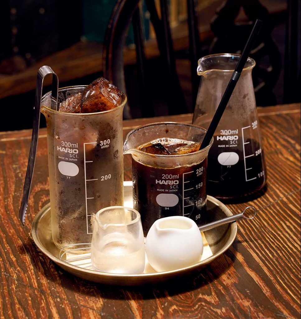 見た目も楽しい「アイスコーヒー」(550円)。フラスコに入ったネルドリップコーヒーを、コーヒー氷入りのビーカーに注いで味わう一杯