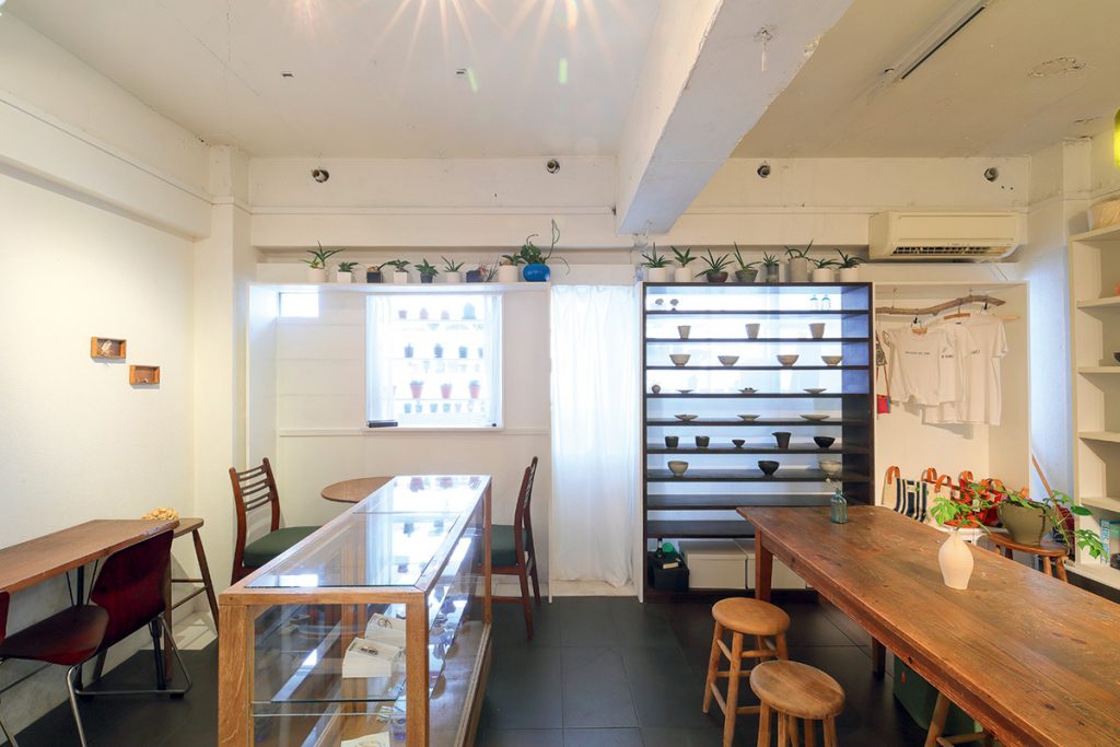 店内に並ぶ器やアクセサリー、サンルームで生き生きと輝くグリーンは購入も可能です