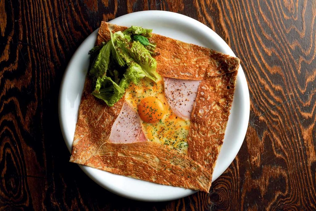 3種のチーズとハム、卵をトッピングした「コンプレット」(990円)。そば粉100%の生地がもっちり!