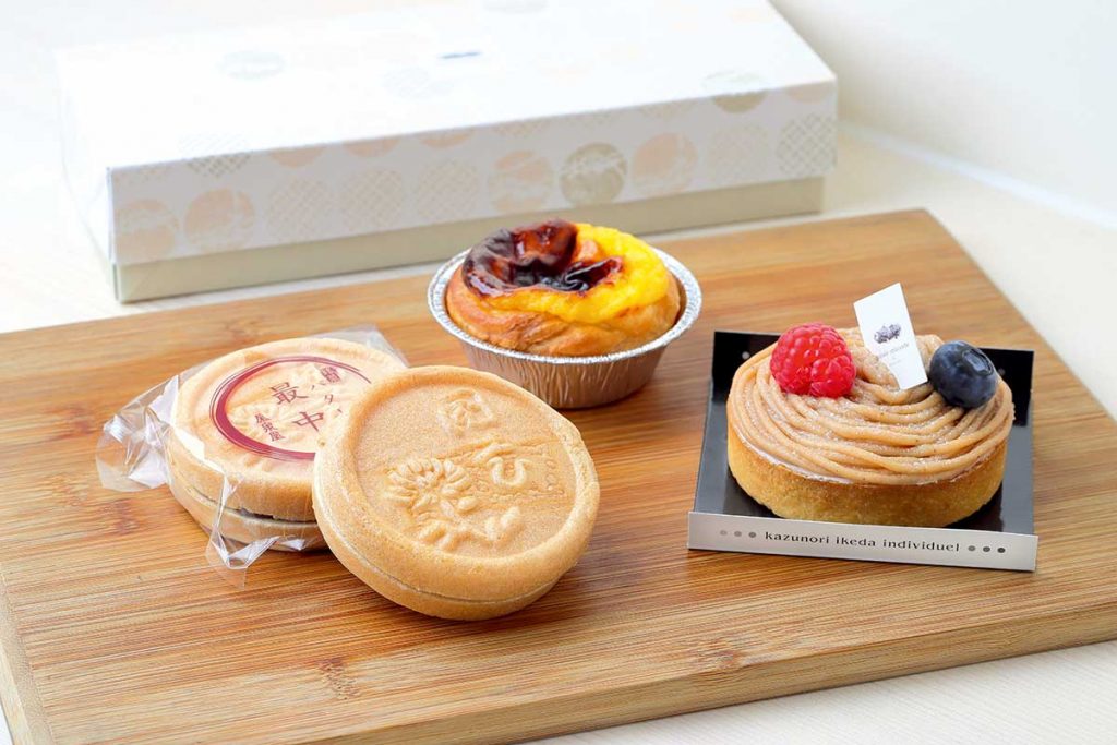 「イズニーバターもなか」(左・230円)、「タルト・マロン・フリュイ・ルージュ」(右・540円)、「パステル・デ・ナタ」(奥・230円)