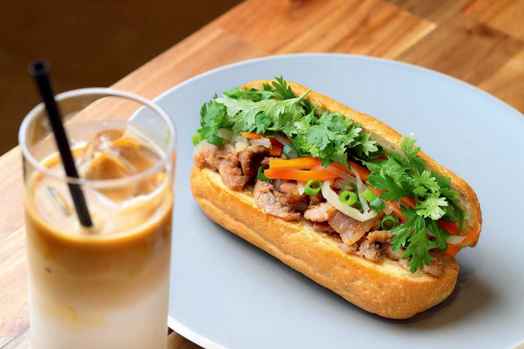 ベトナムのサンドウィッチ「レモングラスの豚焼肉バインミー」(660円)。「アールグレイカフェラテ」(650円)