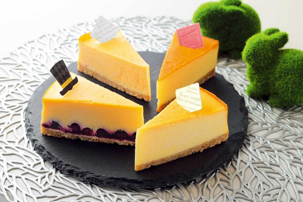 「三日月チーズケーキ」※手前から時計回りに「プレーン」(442円)、「ブルーベリー」「キャラメル」「北海道プレーン」(各388円)