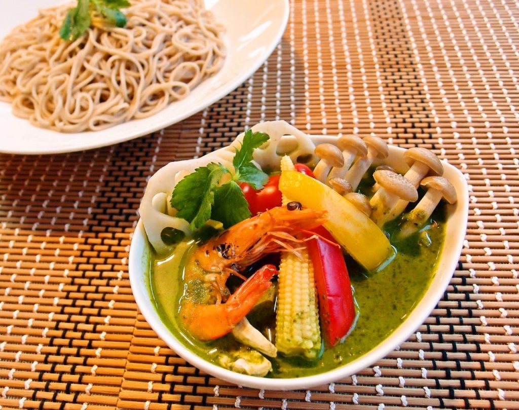 宮城県のそば屋が企画した「宮城あったかそば・うどんスタンプラリー」で提供したひと品。宮城・仙台ならではのカレーそばを考えた時に「杜の都=グリーン」で、グリーンカレーそばが思い浮かんだのこと!辛さを中和させるために地物の甘みが強い玉ネギや「ちぢみほうれん草」を使用。リピーター続出の人気商品となったそうです!