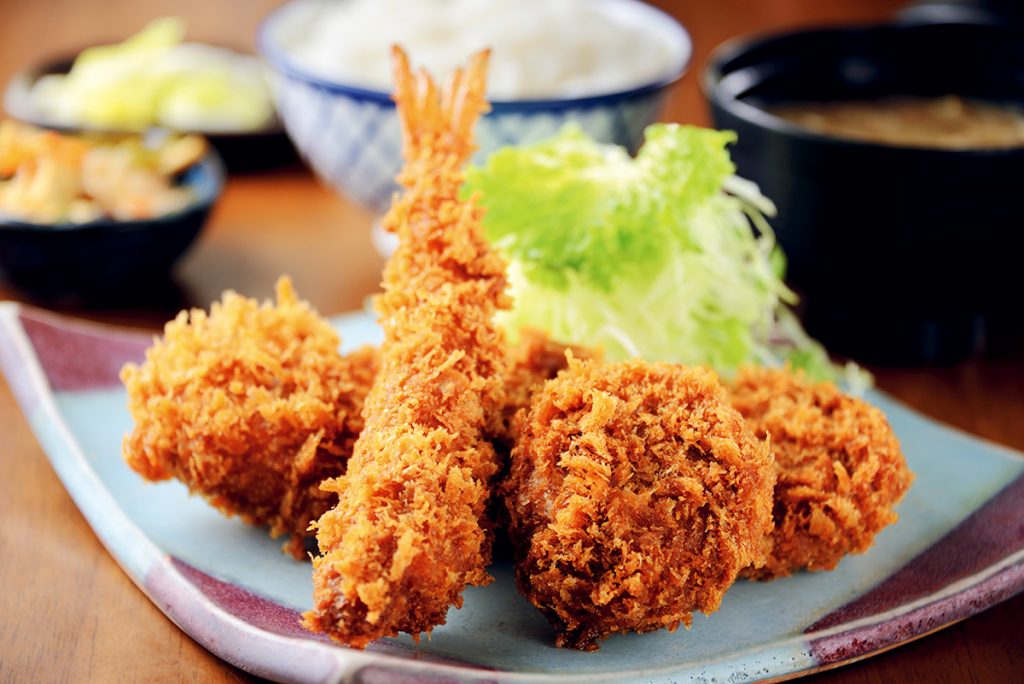 「ミックスフライ定食」(1,015円)※エビフライ、ヒレカツ、カニクリームコロッケ、ご飯、味噌汁、小鉢、漬物