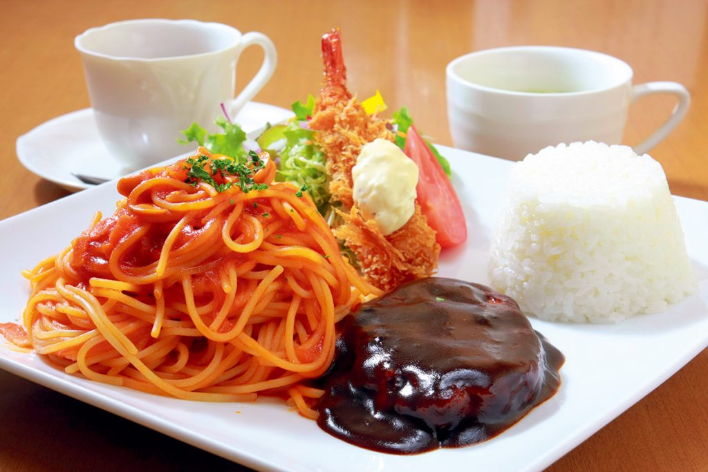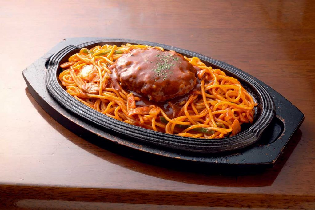 赤い外観が目を引く、レトロな雰囲気の洋食店です。立ち上る湯気と共に鉄板で登場するのは、看板メニューの「ナポバーグ」(920円)。ジュージューと音を立てるハンバーグにナイフを入れた瞬間、肉汁があふれ出します。その旨みを、余すことなく受け止めるのが、もっちり麺のナポリタン。ありそうでなかった、ハンバーグとナポリタンの組み合わせ。アツアツうまうま、やみつき必至のひと皿です。