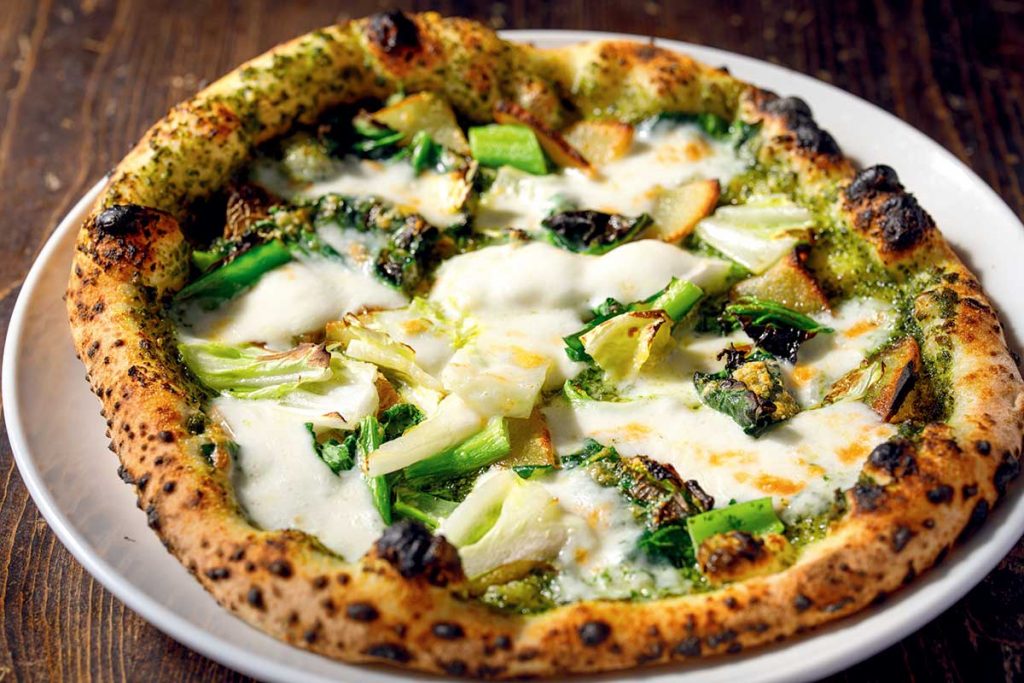 菜食イタリアンの店『L’Albero(アルベロ)』。野菜の根から葉までを活かす「一物全体」を信条とした野菜料理を提供しています。ピッツァやパスタには、肉・魚類は不使用。地元の採れたて野菜を主役に、食材本来の良さを引き出して華麗なるひと皿に仕立てます。野菜の可能性と新たな魅力を感じることができますよ。定番ピッツァの「ジェノバ」(Mサイズ・1,540円)は、濃厚なバジルソースが自慢。白菜、小松菜、雪菜のシャキシャキとした歯触りが楽しめる一枚です。