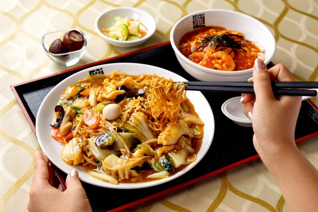 中華料理店の『北竜』。ランチタイムは、人気の麺類とエビチリを組み合わせた3種類のセットメニューが好評ですよ。イチオシは「焼きそばセット」(1,320円)。五目焼きそばは、香ばしい麺と9種類の具材が入ったアツアツの餡が好相性。少し辛めに味付けをしたエビチリ丼とセットで味わえます。ボリューム満点で、お腹を空かせたサラリーマンにぴったり!