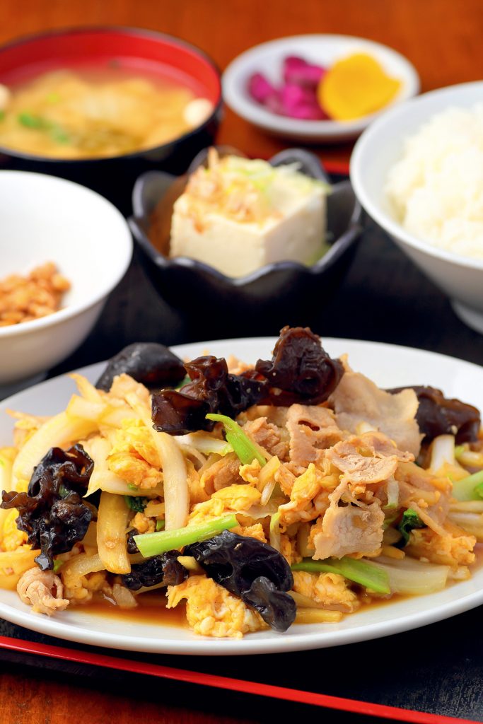「木くらげ玉子炒め定食」(800円)※木くらげ玉子炒め、ご飯、味噌汁、納豆、冷奴、漬物※ご飯大盛+50円、主菜の大盛+100円