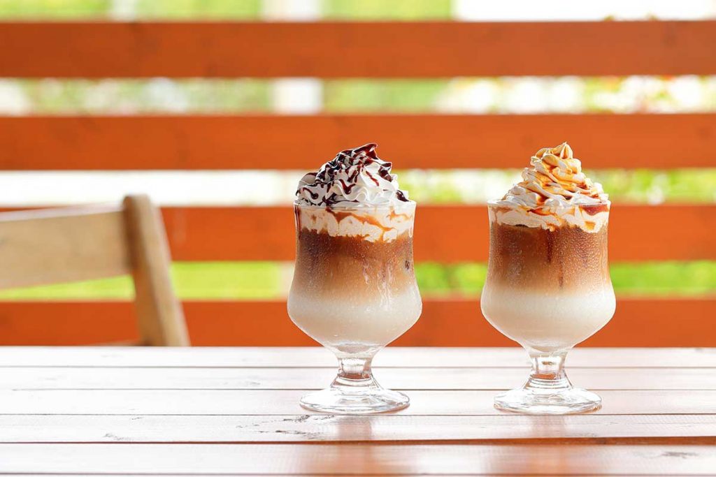 特製アイスコーヒーとミルク、生クリームたっぷりの「ショコラオーレ」「キャラメルオーレ」(各605円)