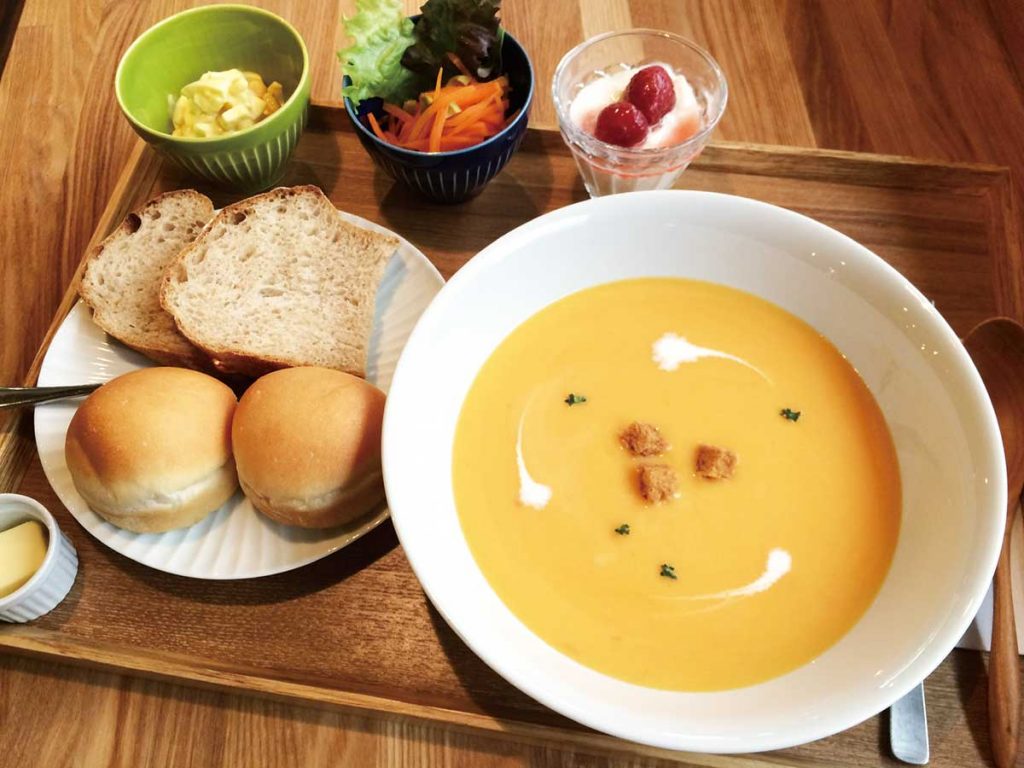 「たっぷりスープと自家製パンのセット」(1,300円)。+400円でドリンク付き