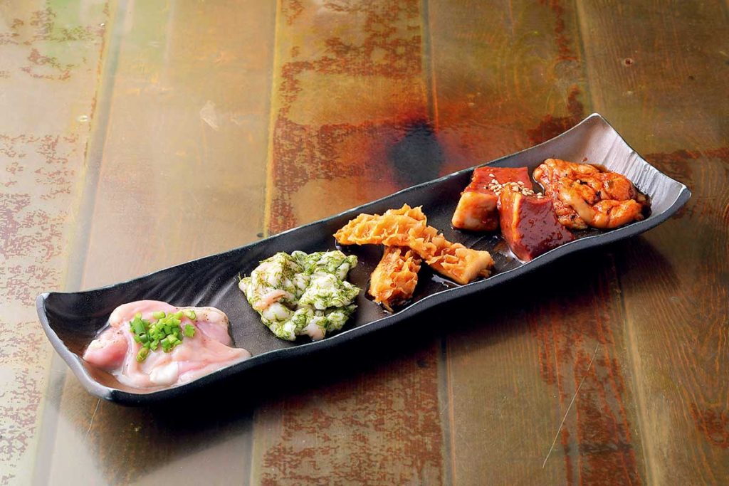 七輪を囲んでワイワイと賑やかな時間を楽しめる一軒です。まず頼むべきひと皿は「豚バラ軟骨」(850円)。コリコリ&ザクザクという独特の歯ごたえを楽しめる、人気メニューです。この歯ごたえは、オリジナルの器具を使い、皮を断ち切らないギリギリの深さで砕いているからこそ。コチュジャンダレをもみ込んだ味わい深い逸品です。新鮮でぷりっぷりのモツもおすすめですよ。ラッパ(豚産道)やコリコリ(牛動脈)、チレ(豚ひ臓)など、希少な部位も提供しています。