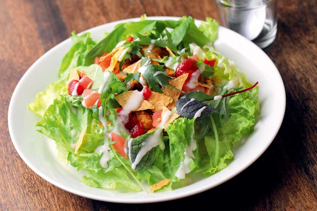 「ボタニカリタン」(1,100円、プチスイーツ付)。たっぷりのサラダの下には、黒コショウと生姜が効いたナポリタンが隠れています
