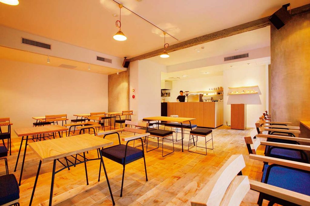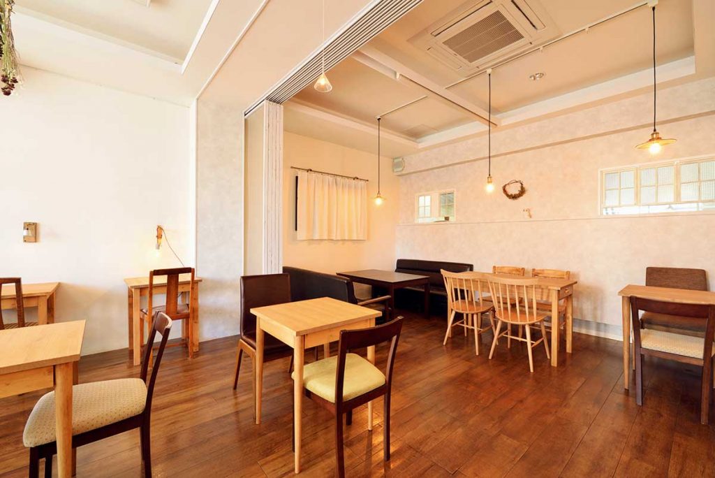 手作りのテーブルと椅子を配した飲食スペース。店内には「地域の人がふと立ち寄れる場に」というオーナー2人の想いが満ちています