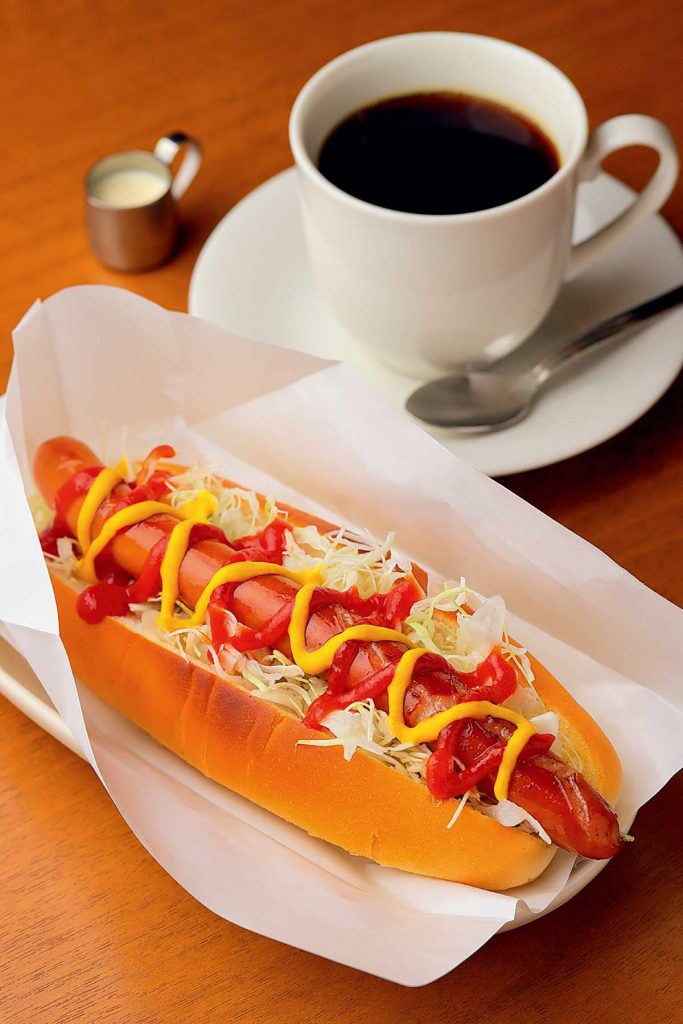 軽く焼いたパンにウインナーとキャベツを挟んだ「ホットドッグSet」は、コーヒー付きで500円。テイクアウトもできます
