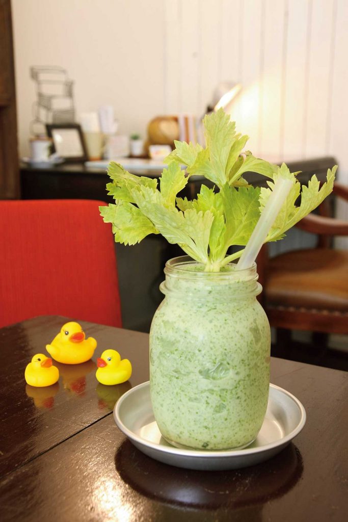 セロリを使った「グリーンスムージー」(660円)。インパクト抜群のビジュアルとは裏腹に、飲みやすく仕上げています