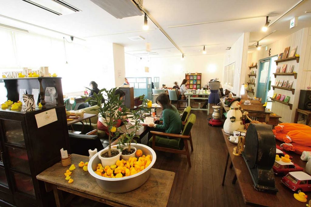 カウンターからソファまで、様々な席を用意。棚やテーブルにはかわいらしい黄色いアヒルが!