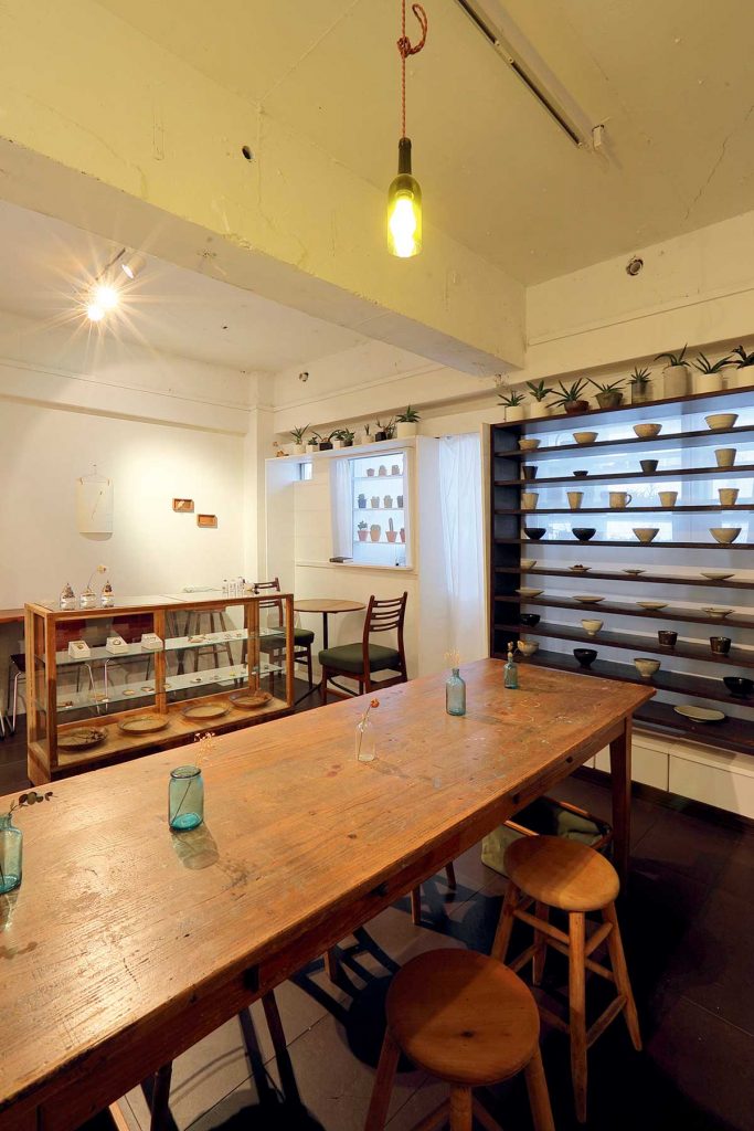 店内はほぼオーナーのDIY!器やアクセサリーは購入も可能です。臨時休業などはSNSで発信しています