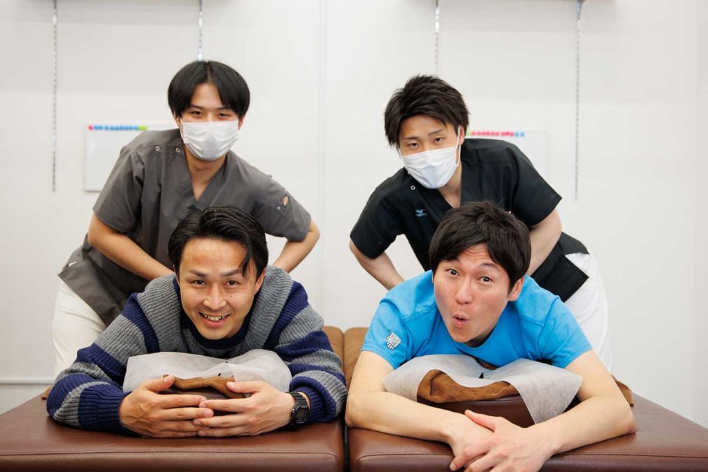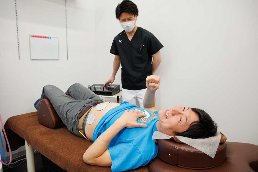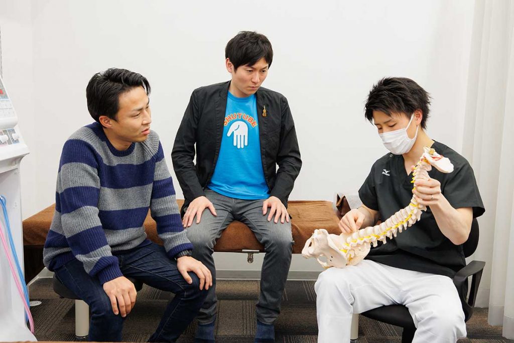 「では、まず姿勢を正しくしていきましょう」ということで秀作には猫背矯正を施術。