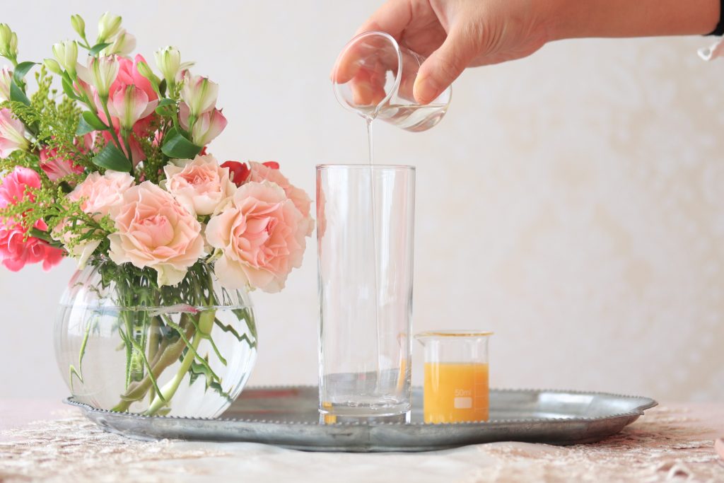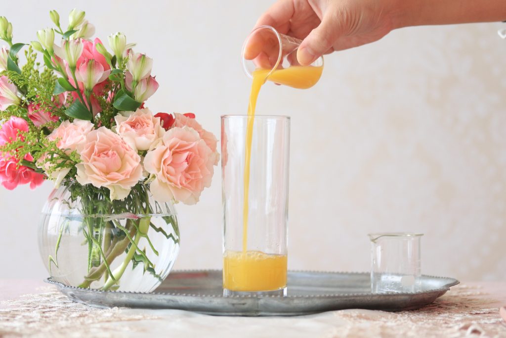 ジュースと一緒に糖度のあるシロップを入れることで下の層が重くなり、そこに糖度が低い紅茶を注ぐことでキレイな層になります。