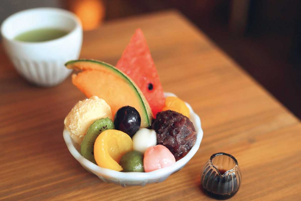 カフェタイム限定の「もちもち白玉大福とほうじ茶ミルク和プリンのフルーツ黒糖寒天あんみつ」(1,023円)