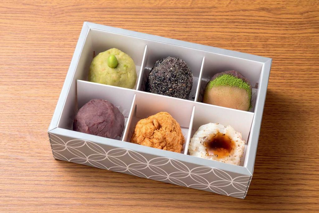 全種類食べたい人におすすめのセット「名物おはぎ(6個入)」(1,080円)。定番は1個180円、季節限定は200円です