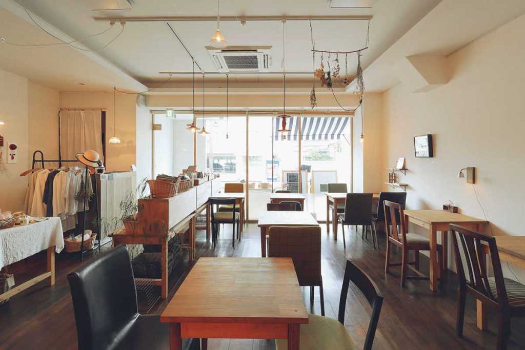 手作りのテーブルと椅子を配した飲食スペース。店内には「地域の人がふと立ち寄れる場に」というオーナー2人の想いが満ちています