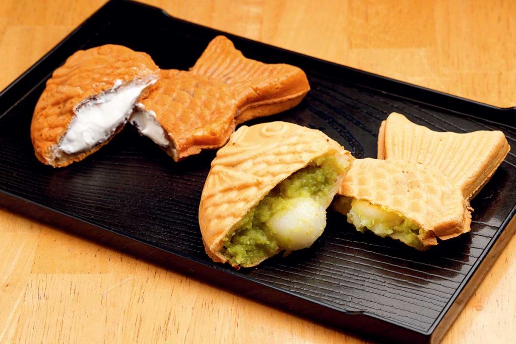 写真手前から「ずんだもち」(180円)と「小倉あんホイップ」(160円)。ホイップクリーム入りは冷して食べる生たい焼きです