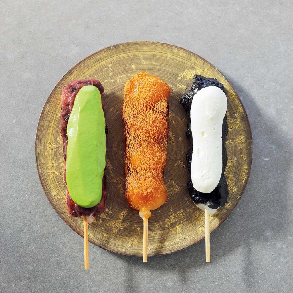 「菓寮だんご」(ミックス・497円)。写真左から「抹茶あずき」「みたらしきなこ」「ごまチーズ」。それぞれ3本セットでの販売もあります