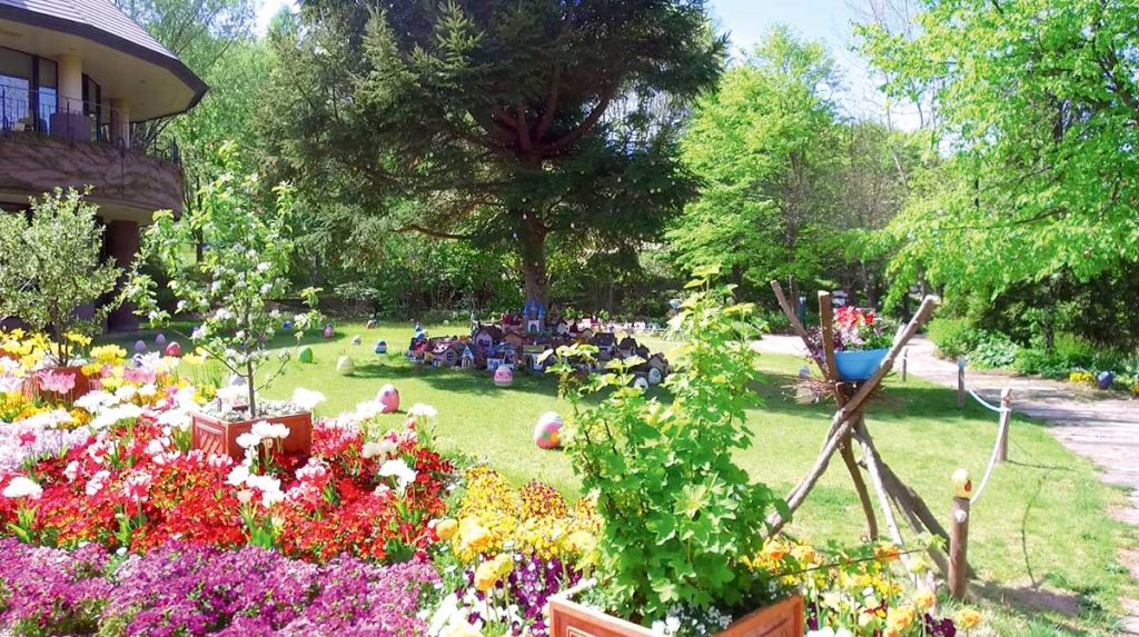自然豊かな薬萊山の麓にある『やくらいガーデン』。15万㎡もの広大な敷地で、400種を優に超える植物が賑やかに出迎えてくれます。花そのものの美しさはもちろん、あちらこちらに楽しい演出が散りばめられていますよ。パッチワークのようにデザインしたビオラの花畑や、黄色いじゅうたんの中にユニークなドアを置いた菜の花畑、イースターフェア限定の500個もの卵のオブジェ…。フォトジェニックな場所としても話題です。
