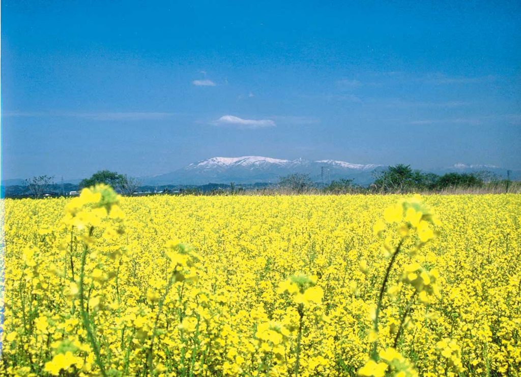 抜けるような青空に残雪の蔵王連峰、黄色いじゅうたんのような菜の花畑が絵になります