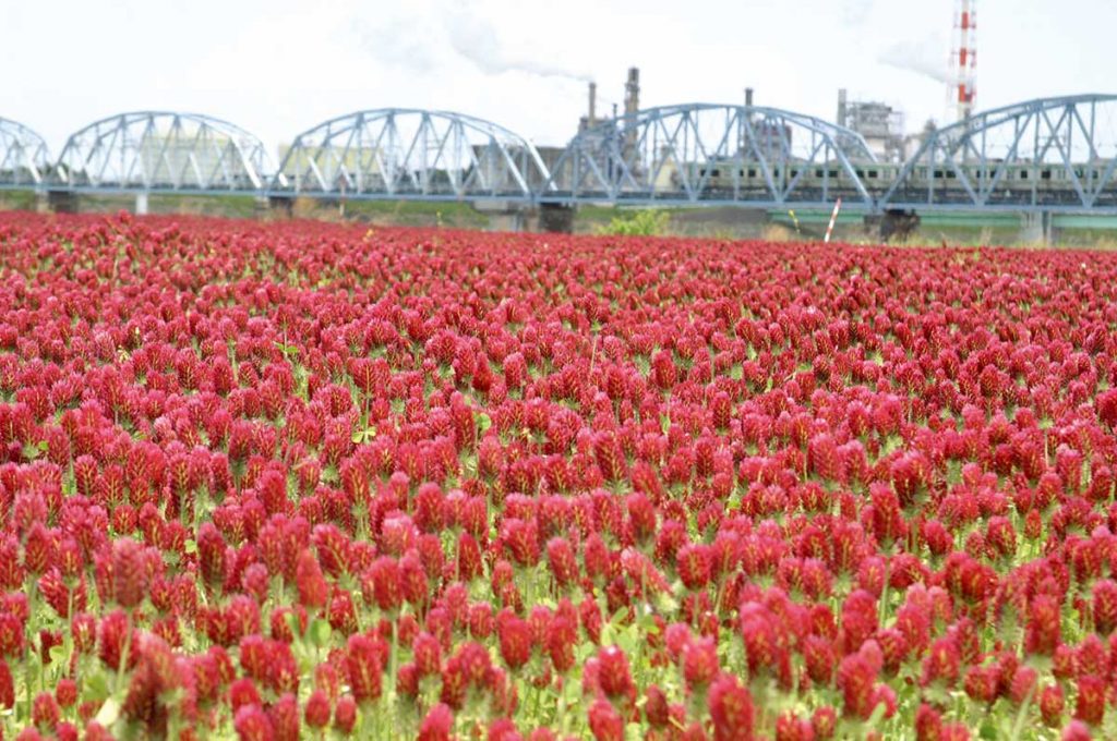 8.阿武隈川の河川敷が赤色に染まる『亘理町 おおくま花畑 クリムソンクローバー』