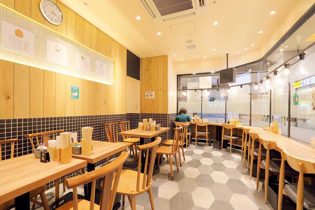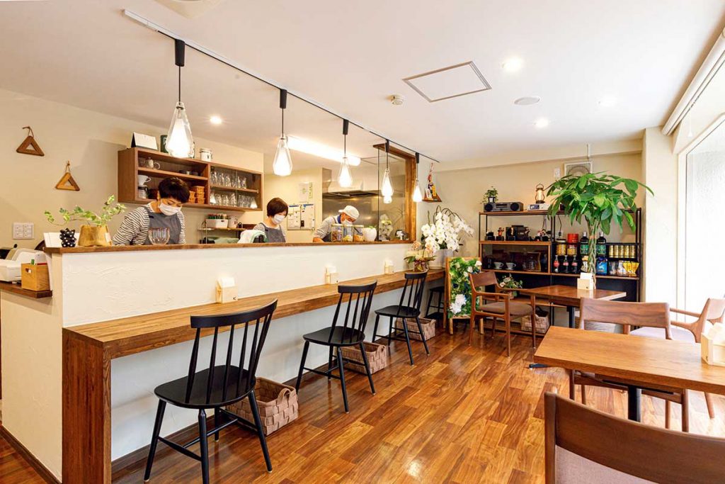 白と木目が基調のシンプルな店内。カウンター席のほか、ゆったりと席間が保たれたテーブル席があります