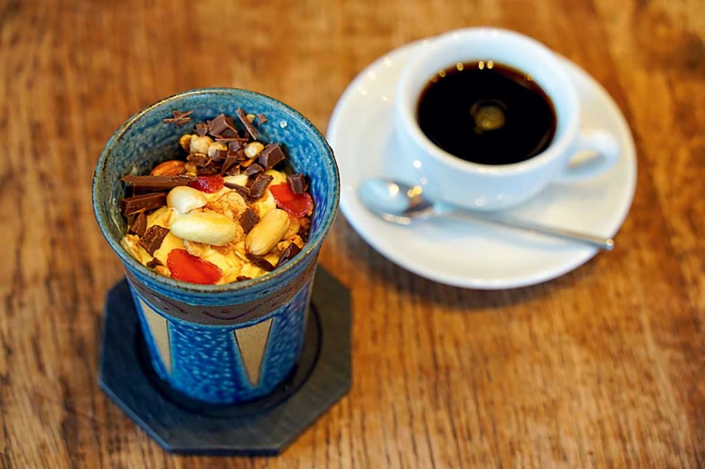 デミタスコーヒー付きの「レオン(男のパフェ)」(638円)。男性でも気兼ねなく食べられるよう、あえて中身が見えない陶器を使用しています