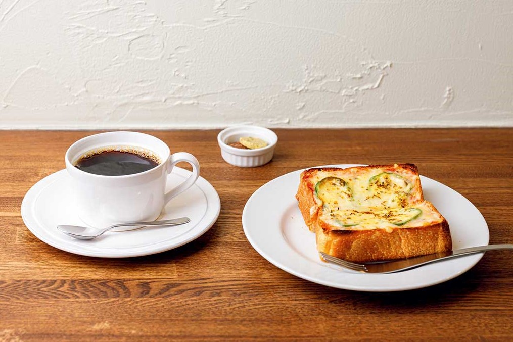 オレガノの風味が際立つ「ピザトースト」(450円)。「ブレンドコーヒー」はセット注文で150円引きに