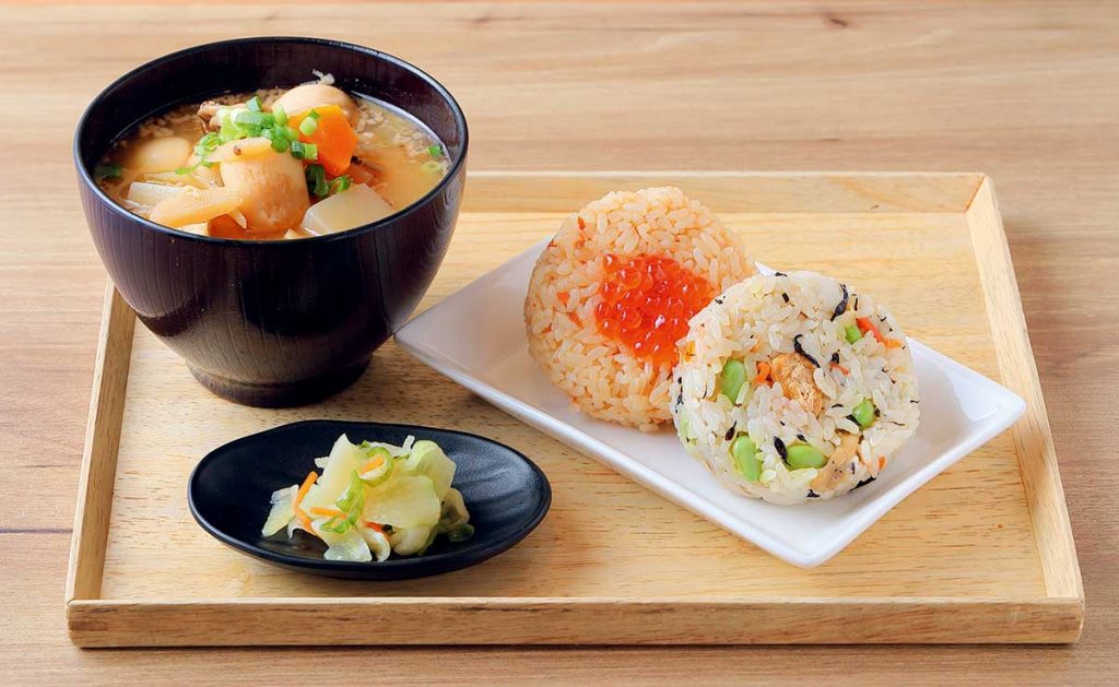 宮城のブランド米・だて正夢や金のいぶきを使った34種のおにぎりから2つをチョイスできる「選べるおにぎり芋煮セット」(864円)